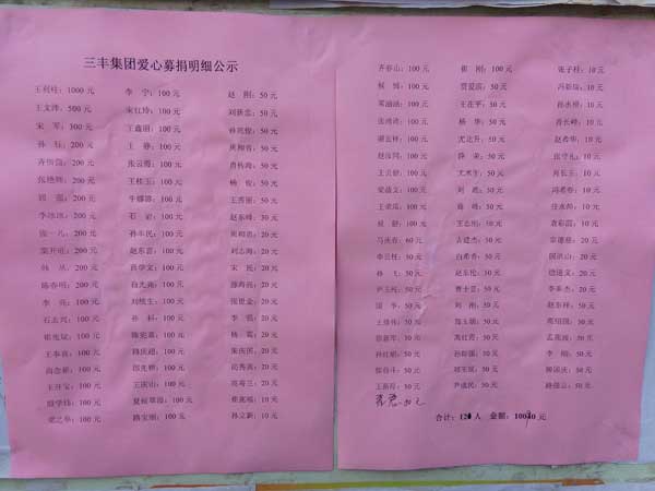 消息傳來,公司全體職工為之震驚,為這么幼小的生命患此重病深感著急和痛心。公司董事長王總對此非常重視,“一方有難,八方支援”,丁修格是我們三豐集團的一員,如今他有難,我公司有責任向他伸出援助之手,幫助他排憂解難,戰勝病魔,盡我們最大的努力。隨后安排相關部門組織全體職工進行募捐,并在公司二樓會議室舉行了獻愛心捐款儀式。從2月18日-22日,集團公司共計募集善款10090元,隨后針對募捐善款在公司進行了張榜公示,公司總經理王文澤將善款親自交到了丁修格手中。